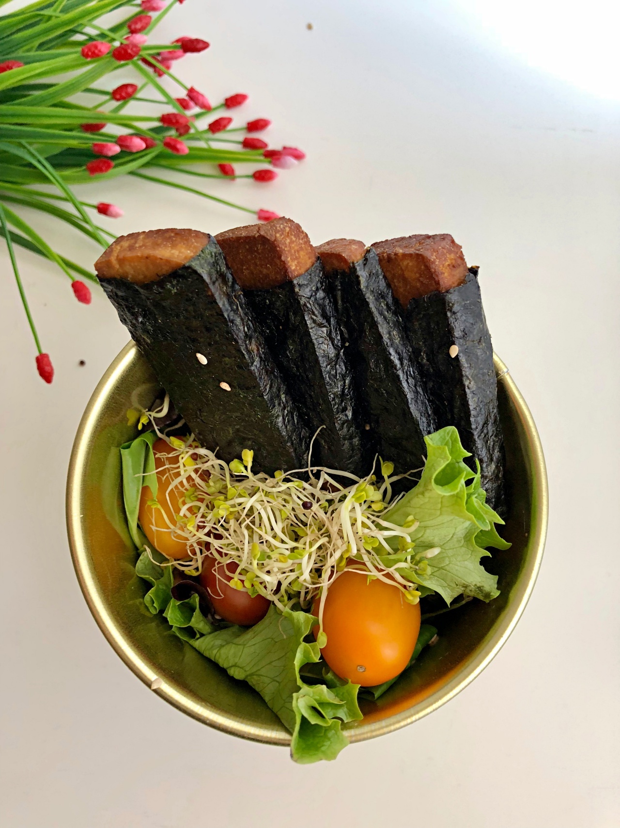 Pasados esos 10 minutos, sacamos nuestras barritas de tofu marinado con alga nori y ya tenemos el plato listo. En este caso lo he acompañado de una buena ensalada con tomates cherry, pepino y unos brotes germinado de brócoli. Como aderezo de la ensalada hice una vinagreta con vinagre de arroz, aceite, sal y pimienta.
