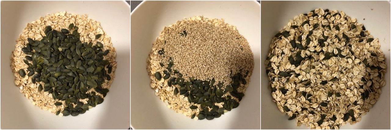Vamos a empezar mezclando los elementos secos de nuestro muesli casero. En un recipiente hondo, incorporaremos todos los ingredientes secos: los copos de avena, las pipas de calabaza, el sésamo tostado y la sal.