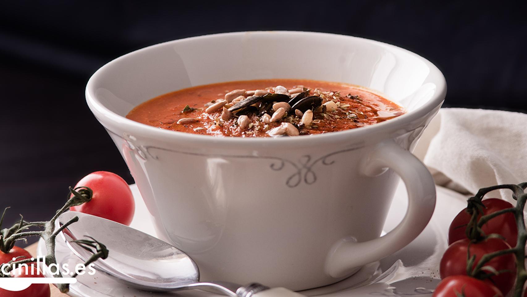 Unos tomates asados, con cebolla, zanahoria, guindilla y pimiento rojo. Todo hecho crema y cubierto con pipas y semillas variadas. Si empleas caldo de verduras, es un plato 100% vegano, sano y de inmejorable sabor. Prueba este método para preparar una crema de verduras asadas. A partir de ahora, no vas a querer hacerla de otra manera.