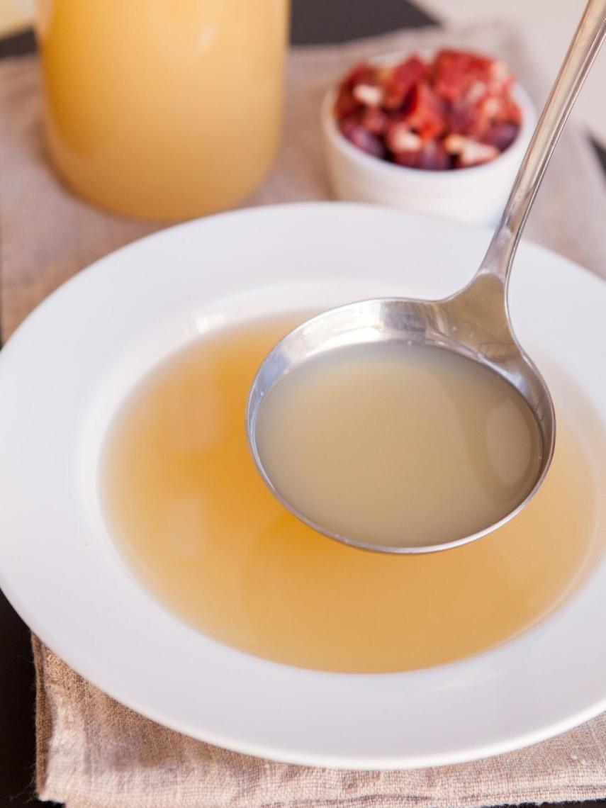 En la misma olla ponemos tres litros de agua limpia, los huesos que hemos reservado, la cebolla tostada y los puerros limpios y cortados en trozos. Tapamos la olla y cocinamos nuestro caldo a fuego lento durante tres horas. Pasado este tiempo lo colamos y dejamos reposar media hora. Pasado este tiempo, retiramos la grasa superficial con ayuda de un cazo y guardamos en la nevera durante al menos cuatro horas, con eso conseguiremos que la grasa se solidifique en la superficie.