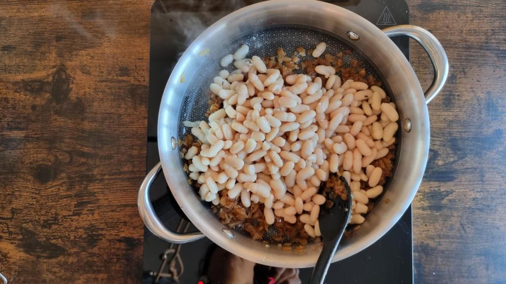 Añadir las alubias y cocer con el caldo