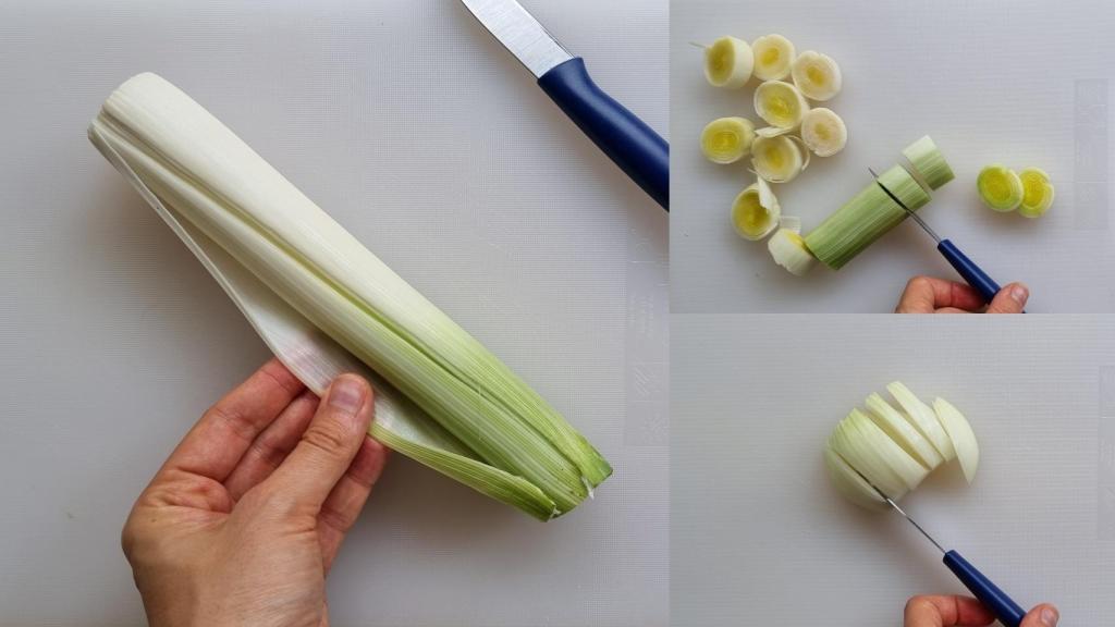 Limpiar los puerros, quitar la parte verde y cortar la base con las raíces. Retirar también la capa exterior de los puerros y lavarlos bien para retirar cualquier tipo de tierra que pueda tener. Pelar también la cebolla. Picar ambas cosas, sin necesidad de que sea muy pequeño.