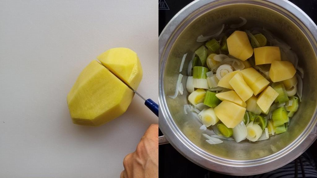 Lavar la patata y pelarla también. Trocearla y añadirla a la cebolla y puerros pochados. Remover bien durante un par de minutos y agregar el agua suficiente para cubrirlo todo pero sin pasarse.