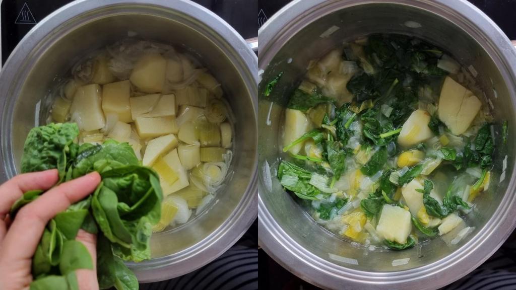 Lavar las espinacas bien, puestas en un colador y con abundante agua fría. Escurrirlas y añadirlas a la olla con el fuego ya apagado. Remover bien y dejar tal cual durante un par de minutos. Las espinacas se cocinarán con el calor residual. Retirar un par de cazos de caldo y reservarlos.