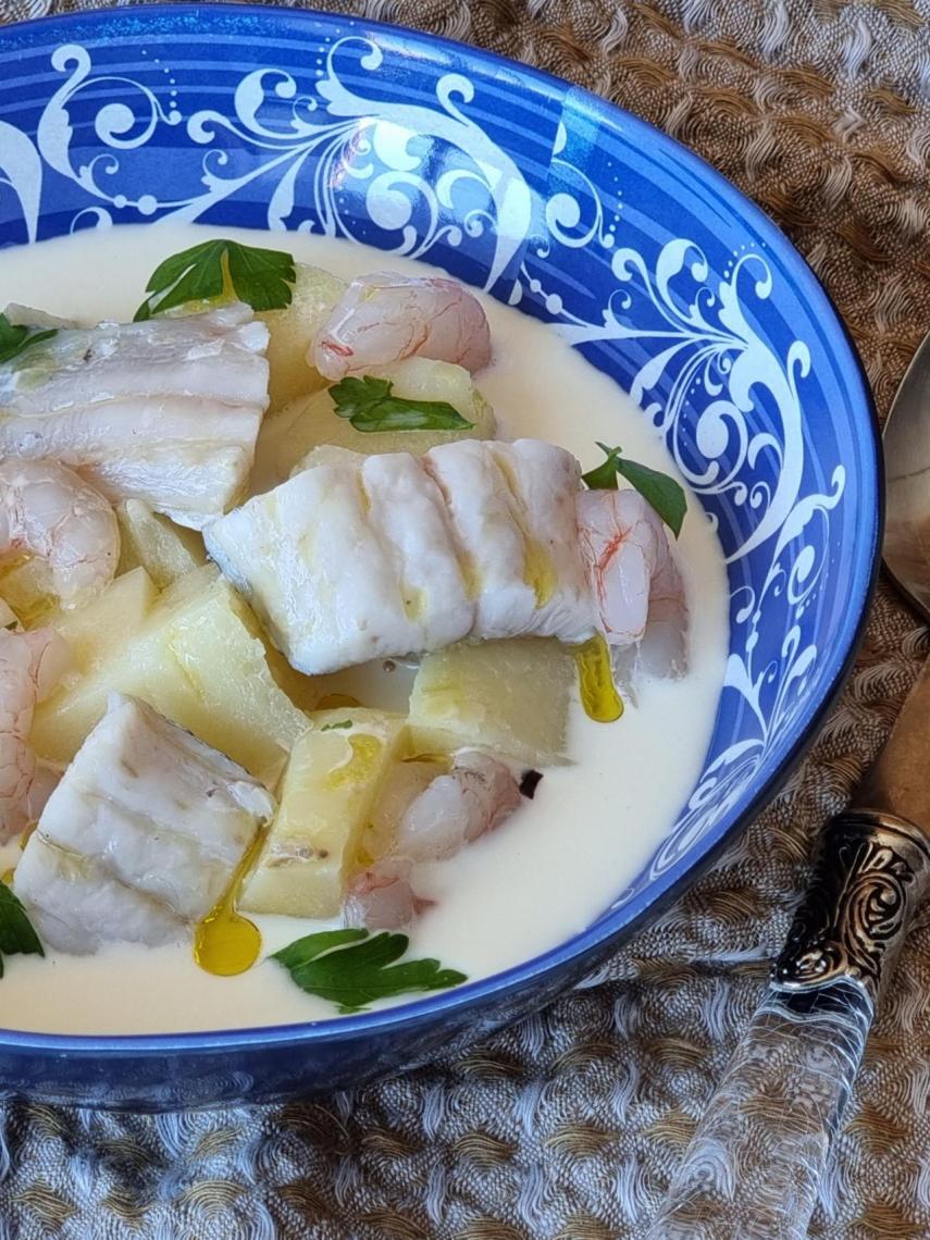 Ir añadiendo cacillos de caldo a la mayonesa y mezclar con unas varillas. Por último, poner a punto de sal y agregar algo más de limón si se quiere. Verter sobre las patatas y el pescado y las gambas cocidos. Dar un punto de calor en el fuego y servir con unas hojitas de perejil. Esta sopa ha de ser consumida en el momento.
