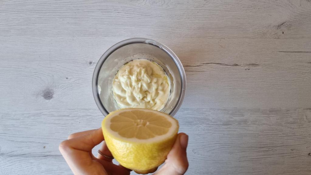 Mientras que las patatas se cuecen, preparar la mayonesa emulsionando el huevo con el aceite de oliva. Ambos deben estar a la misma temperatura. Empezar con la batidora al mínimo puesta abajo del todo, e ir levantándola poco a poco a medida que veamos que la mayonesa se liga. Condimentar con sal y el zumo de limón, mezclar con una cuchara y reservar.