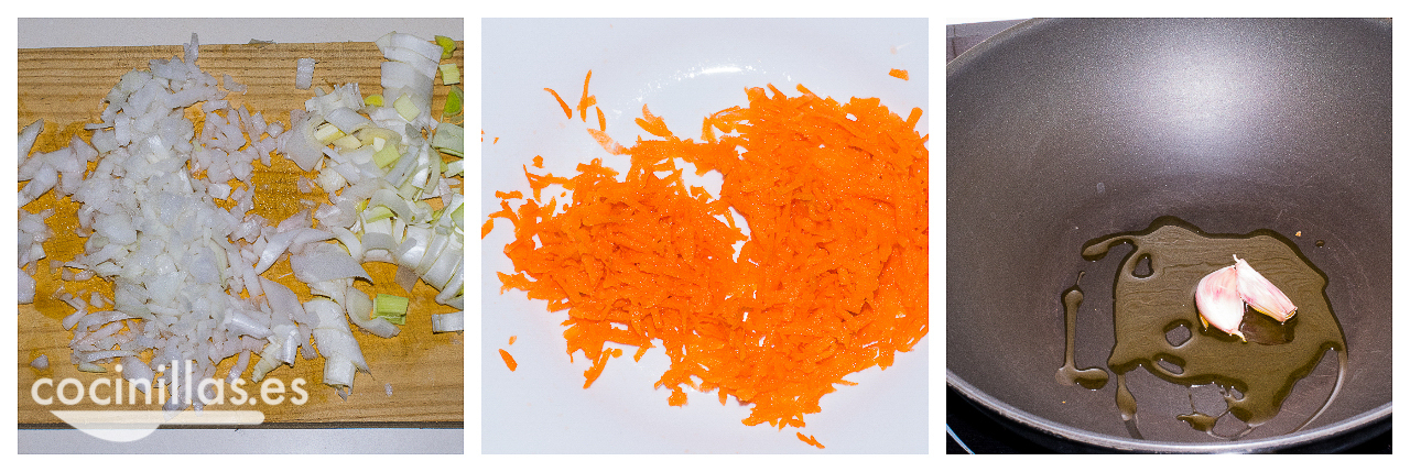 Cortamos media cebolla y el puerro finamente. Rallamos también 1 zanahoria y troceamos finamente los 150 g de champiñones y los 150 g de tofu, reservamos. En una sartén honda ponemos dos cucharadas de aceite de oliva virgen extra y 2 dientes de ajo a dorar. Cuando doren los retiramos para que no amargue.