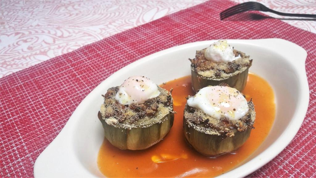 Cómo hacer alcachofas rellenas con salsa de jamón y huevos de codorniz