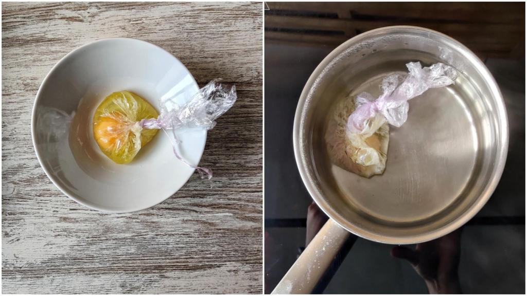 Hacer huevo poché. Colocar un trozo de papel film en un bol. Untar bien con aceite y cascar un huevo encima. Añadir una pizca de sal y cerrar el papel film haciendo una especie de bolsita (cuidado de que no queden huecos por los que pueda entrar agua). Poner agua a hervir en un cazo. Cuando alcance el punto de ebullición, bajar el fuego al mínimo y sumergir el huevo. Contar 4 -6 minutos dependiendo del tamaño y sacar a agua fría para cortar la cocción.