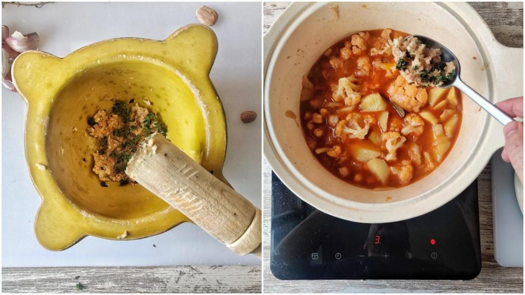 Mientras se cuece, hacer la majada en un mortero. Primero los ajos con un poco de sal y luego las almendras y el tomillo. Machacar todo hasta que quede una pasta uniforme. Añadir al guiso a falta de 1 minuto para terminar la cocción