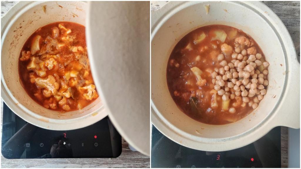 Regar con el caldo de verduras o con el agua hasta cubrir los ingredientes. Tapar y cocinar durante 15-20 minutos o hasta que la patata esté tierna y la coliflor también. Cuanto más pequeña esté chascada la patata, mejor porque menos tiempo tardará en hacerse y más en su punto quedará la coliflor. Incorporar los garbanzos en los últimos tres minutos, siempre muy bien enjuagados.