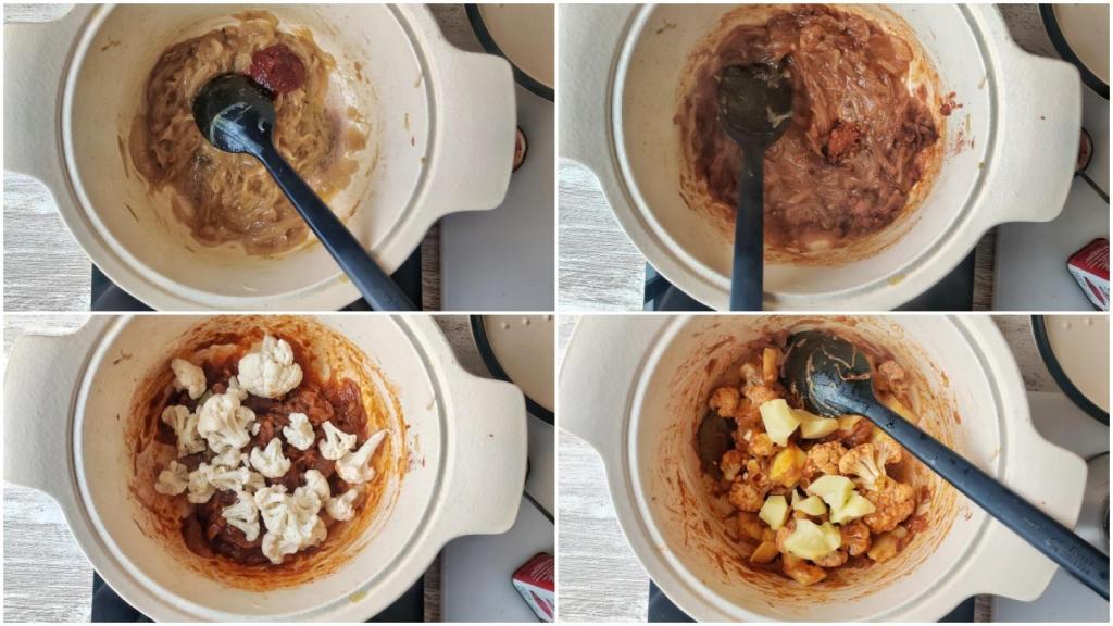 Agregar el los condimentos y la coliflor y mezclar bien. Incorporar también la patata y los garbanzos.