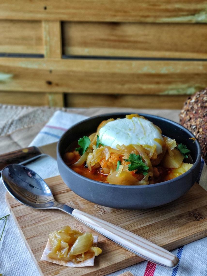 Emplatar el guiso de coliflor y garbanzos con el huevo coronando la creación. Este guiso, al llevar patata no sigue la regla de que todos los guisos al día siguiente están mejor sino que su mejor momento es recién preparado.