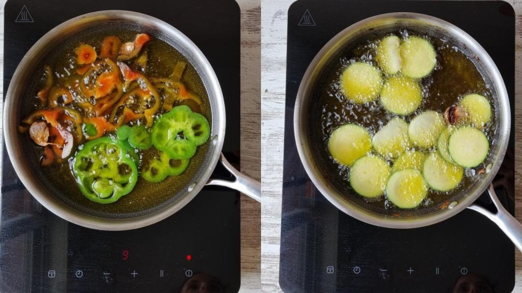 En ese mismo aceite freír los pimientos hasta que empiecen a tomar color, retirar. Hacer también lo mismo con las rodajas de calabacín. Una vez frito todo y bien escurrido añadir sal a todo.