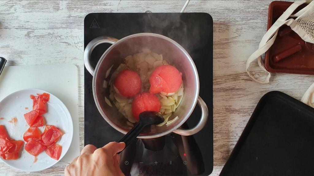 Lo primero que haremos será preparar el tomate frito que es lo que más tiempo lleva. Para ello, pelar los tomates escaldándolos previamente si nos resulta más fácil, y pochar en una olla con aceite el diente de ajo y la cebolla picada. Cuando esté todo bien tierno añadir los tomates pelados, la sal, tapar y dejar cocinar a fuego suave hasta que al meter una cuchara los tomates se deshagan.