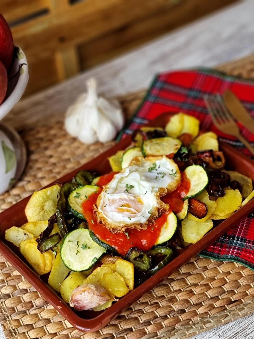 A muchos les echará para atrás que este plato sea un plato de fritos 100 % porque se sofríe el tomate, se fríen las verduras y se fríe el huevo, pero estamos hablando de aceite de oliva todo el rato que ya sabéis que es tremendamente saludable para todos. Aún así, os doy la opción de utilizar el horno en lugar de freír poniendo todas las verduras en bandejas, calentar el horno a 210 ºC, añadir un chorrete de aceite y de sal y asar hasta que estén tiernos. No queda igual, no os voy a mentir, pero el truco hay que darlo.
