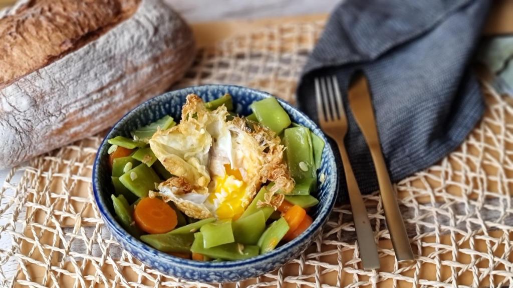 Esta receta tradicional pero muy fácil y rápida requiere sólo de 4 ingredientes: judías verdes, ajo, zanahoria y huevo y es maravillosa. Nos invita a comer verdura de una forma sana pero diferente, muy apetitosa, con pocas calorías si no sumamos el huevo frito. Un aporte que es prescindible y que también podríamos incorporar pochado o a baja temperatura para evitar la fritura.