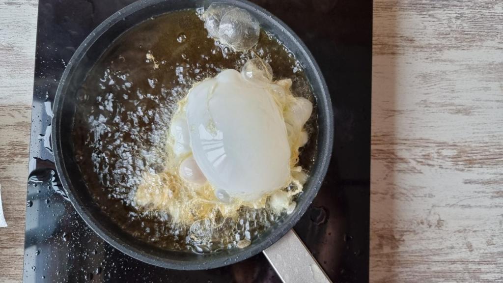 Paralelamente calentar una sartén con abundante aceite de oliva, que esté bien caliente, y cascar el huevo sobre el aceite para freírlo. Un truco es poner el huevo en una taza o vaso y verterlo desde ahí porque es más fácil. No tocar el huevo durante 45 segundos y después retirarlo con una espumadera. Servir el huevo frito encima de las judías verdes al ajillo con zanahoria, aunque en realidad esto no se hacía en casa de mi abuela...