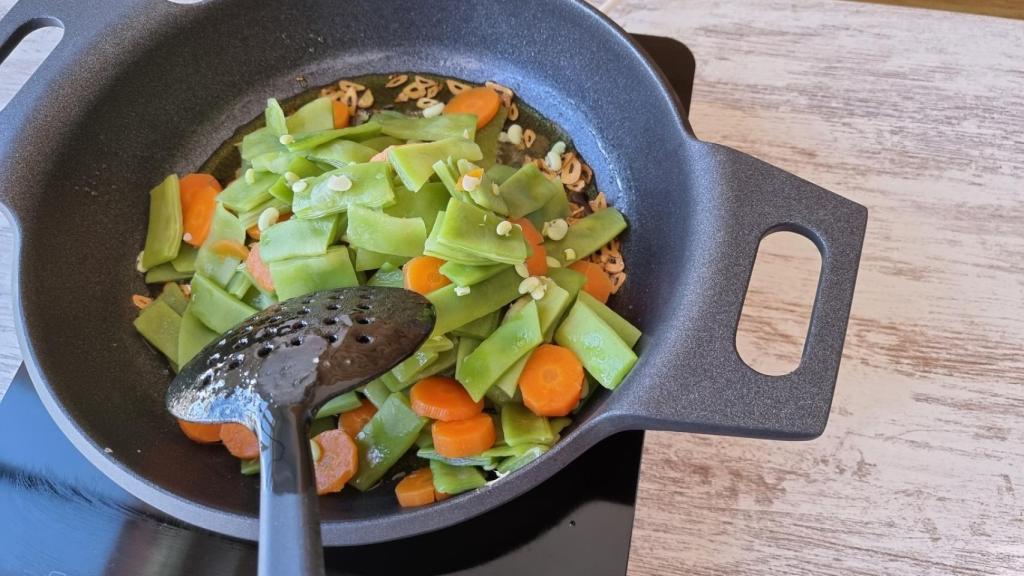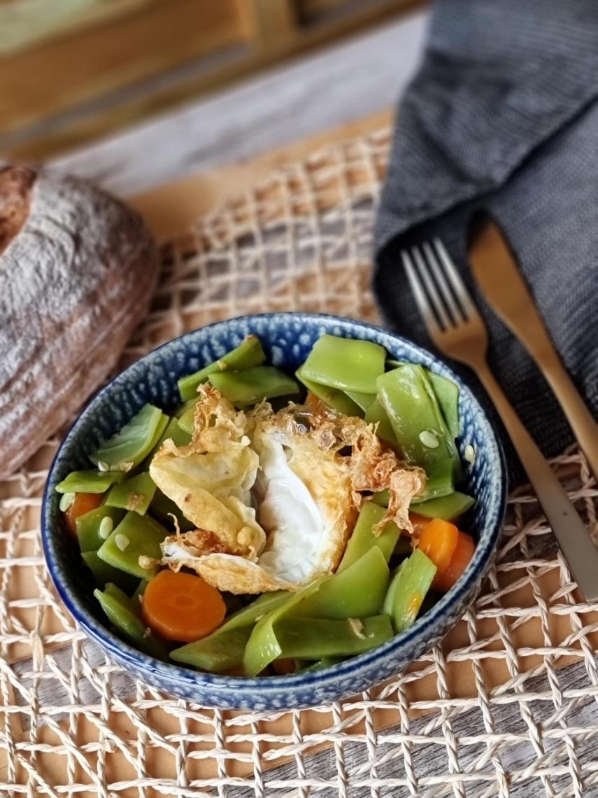Cómo hacer judías verdes al ajillo con zanahorias y huevo frito