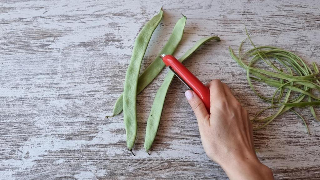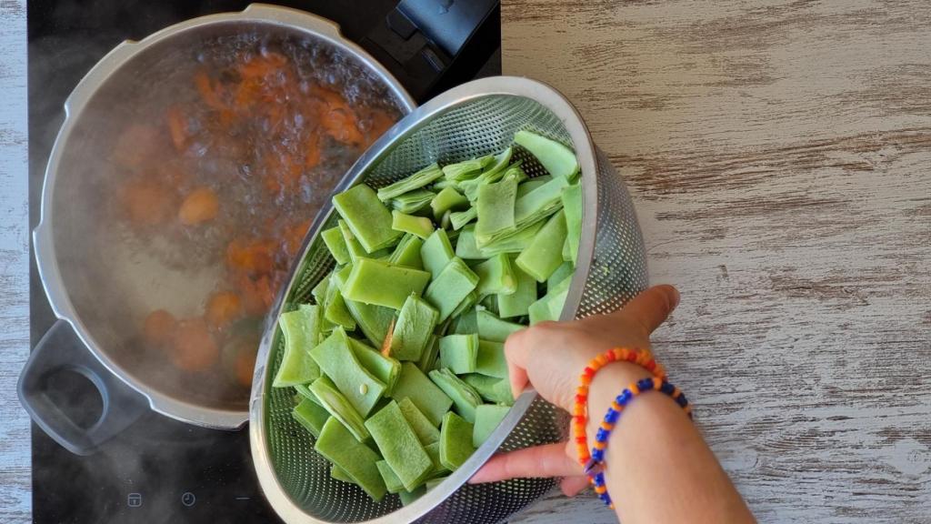 Limpiar muy bien las judías verdes. Con la ayuda de un pelador quitar los laterales, unos nervios/hilos duros que se suelen quedar duros con más facilidad. Después quitar también las puntas y trocear las judías verdes al gusto. A mí me gusta que sean de bocado, pero hay también quien las corta muy pequeñas para comerlas con cuchara.