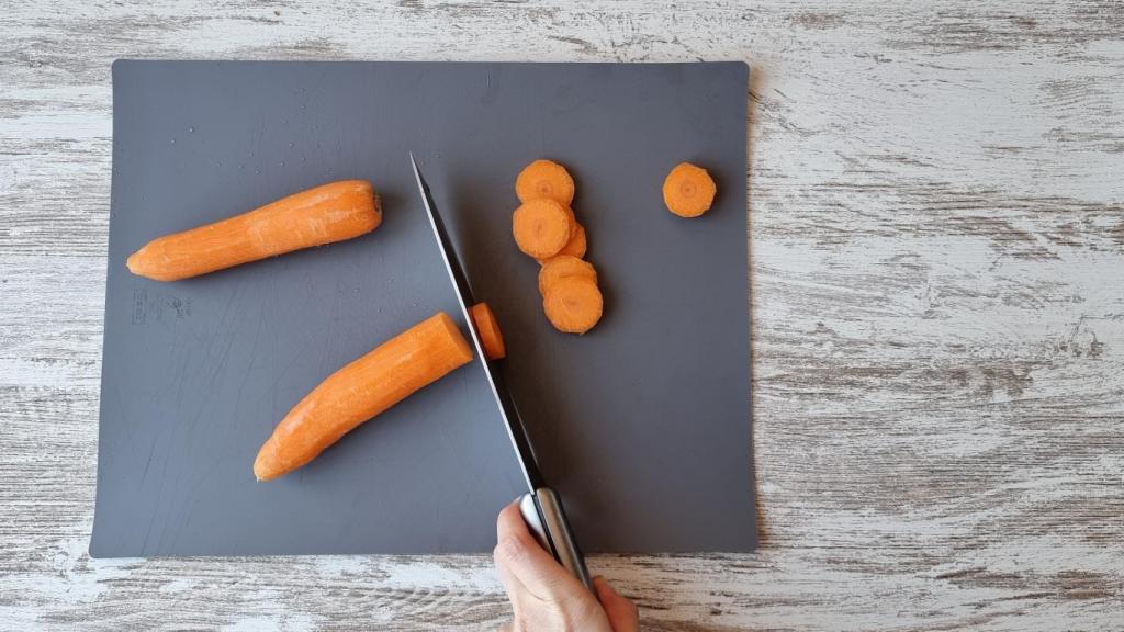 Preparar una olla al fuego con abundante agua y sal, dejar hasta que empiece a hervir. Mientras tanto pelar las zanahorias, quitar la base y trocear en discos finos de aproximadamente dos milímetros.