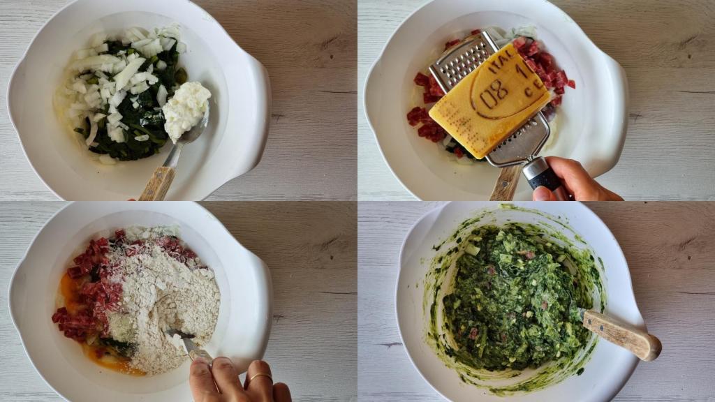 Pelar la cebolla y picarla finita. En un bol, mezclar las hojas de acelga cocidas con la cebolla, el queso tipo cottage, la harina, el fuet picado, sal, pimienta negra, huevo y queso parmesano. Juntar todo bien hasta que sea una masa manejable, si es necesario incorporar un poco más de harina. Agregar también la levadura.