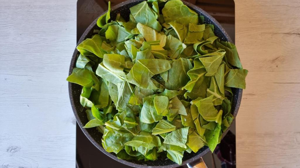 Lavar bien las hojas de las acelgas y trocear. Cuando la cebolla y el puerro estén bien pochados, añadir entonces las hojas de acelga y remover constantemente durante unos 15 minutos hasta que las acelgas estén bien hechas. Soltarán líquido, y hay que dejar que se evapore lo máximo posible.