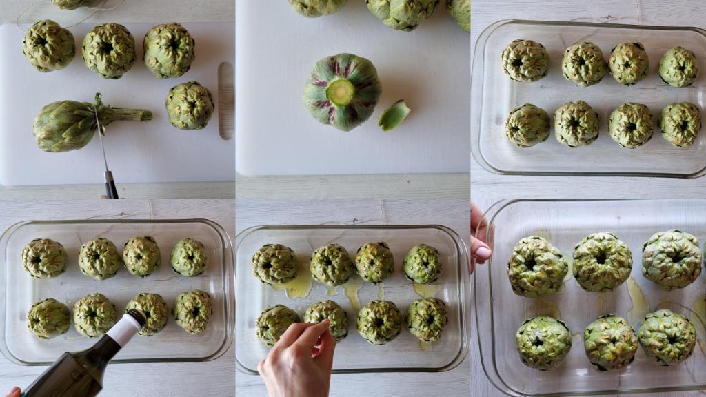 Precalentar el horno a 180 ºC y seleccionar una bandeja donde vayan a caber todas las alcachofas puestas como si estuvieran sentadas sobre la bandeja. Cortar los tallos de las alcachofas para que tengan una buena base y colocarlas sobre la bandeja. Regarlas con un poco de aceite de oliva hasta que estén bien impregnadas.