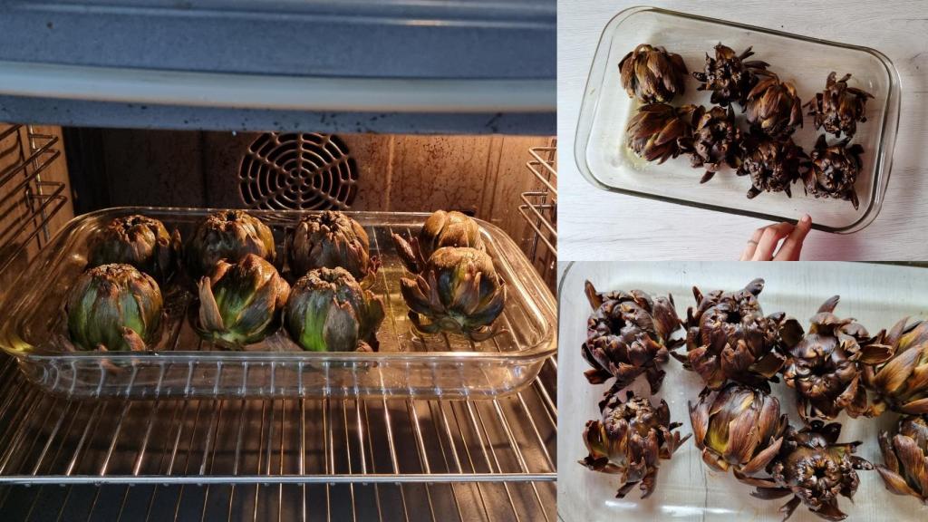 Introducir las alcachofas en el horno y cocinar durante 45 minutos. Si vemos que nuestro horno las empieza a quemar mucho (no pasa nada porque estén un poco quemadas), las podemos tapar con papel de aluminio. Tras ese tiempo, apagar el horno y dejar dentro las alcachofas hasta que el horno se haya enfriado por completo.