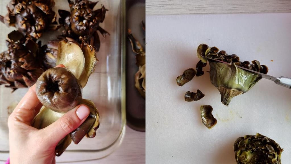 Aun intentando ser fieles a la receta tradicional, para la ocasión se muestra otra opción para cocinar alcachofas y tener que evitar la tediosa parte de la limpieza previa: asar las alcachofas enteras. Sólo habrá que quitar el tallo, regarlas con aceite de oliva e introducirlas en el horno tal cual. Las capas exteriores se quemarán protegiendo el corazón interior que se irá 'confitando' poco a poco. Clave es dejar las alcachofas dentro del horno una vez lo hayamos apagado, para que la cocción siga con el calor residual. Tras esto, pelarlas será mucho más sencillo pues la propia alcachofa nos dirá cuántas capas hay que quitar.