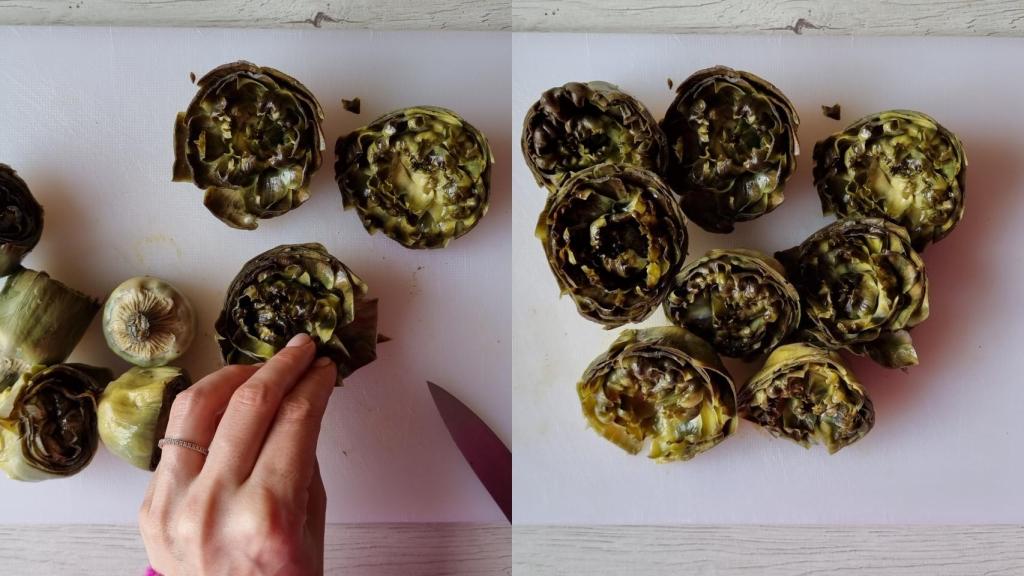 Cuando las alcachofas ya estén frías, pelarlas simplemente utilizando las manos, las hojas se separarán sin complicación. Hay que pelarlas hasta que veamos que llegamos al corazón tierno. Tras las primeras hojas quitadas, dar un corte en la parte superior para retirar las puntas.