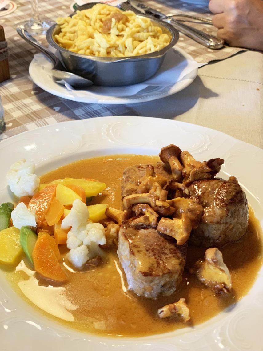 Otro de los platos más reseñables del restaurante, es la carne de cerdo con setas de temporada y späetzle, un tipo de pasta muy conocida en Alemania que se suele tomar como acompañamiento de platos de carne o como plato único. También sirven otras carnes como el chateaubriand, el escalope de ternera a la manera suiza o venado. De postre, no olvides probar su tarta Selva Negra, muchos la consideran como una de las mejores de la región.
