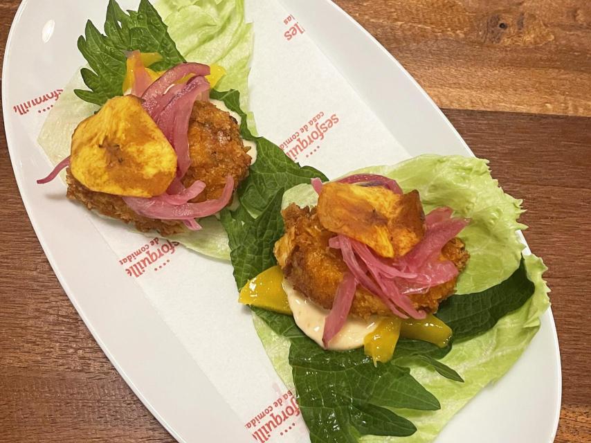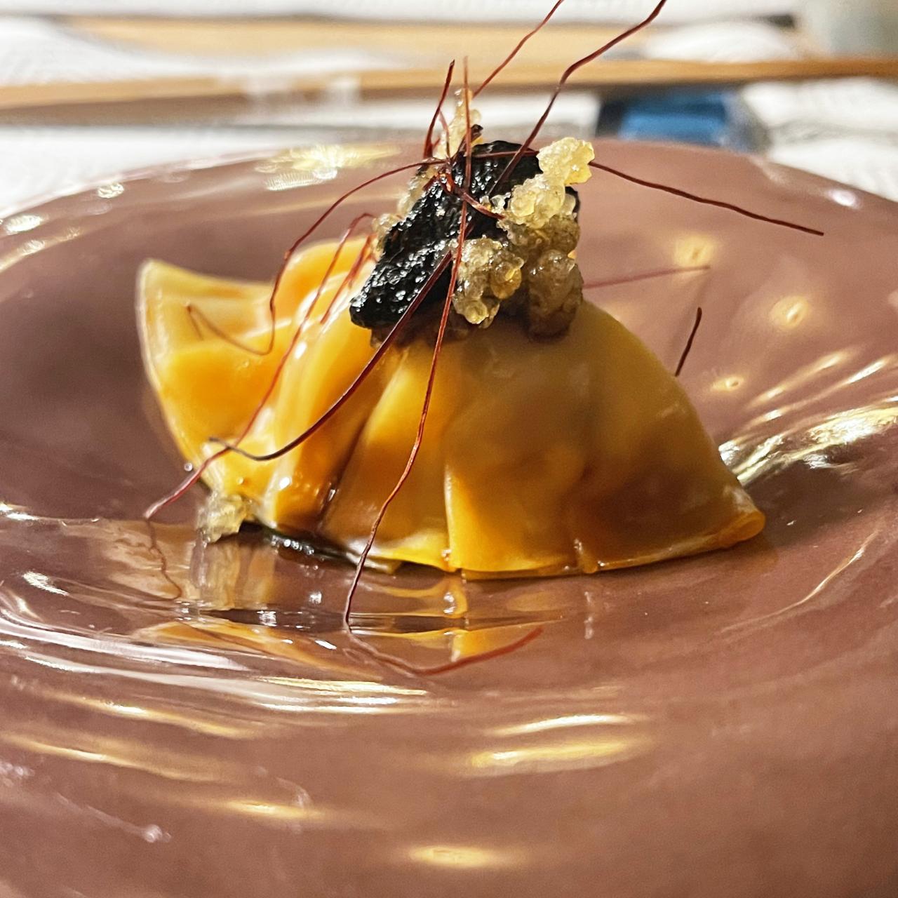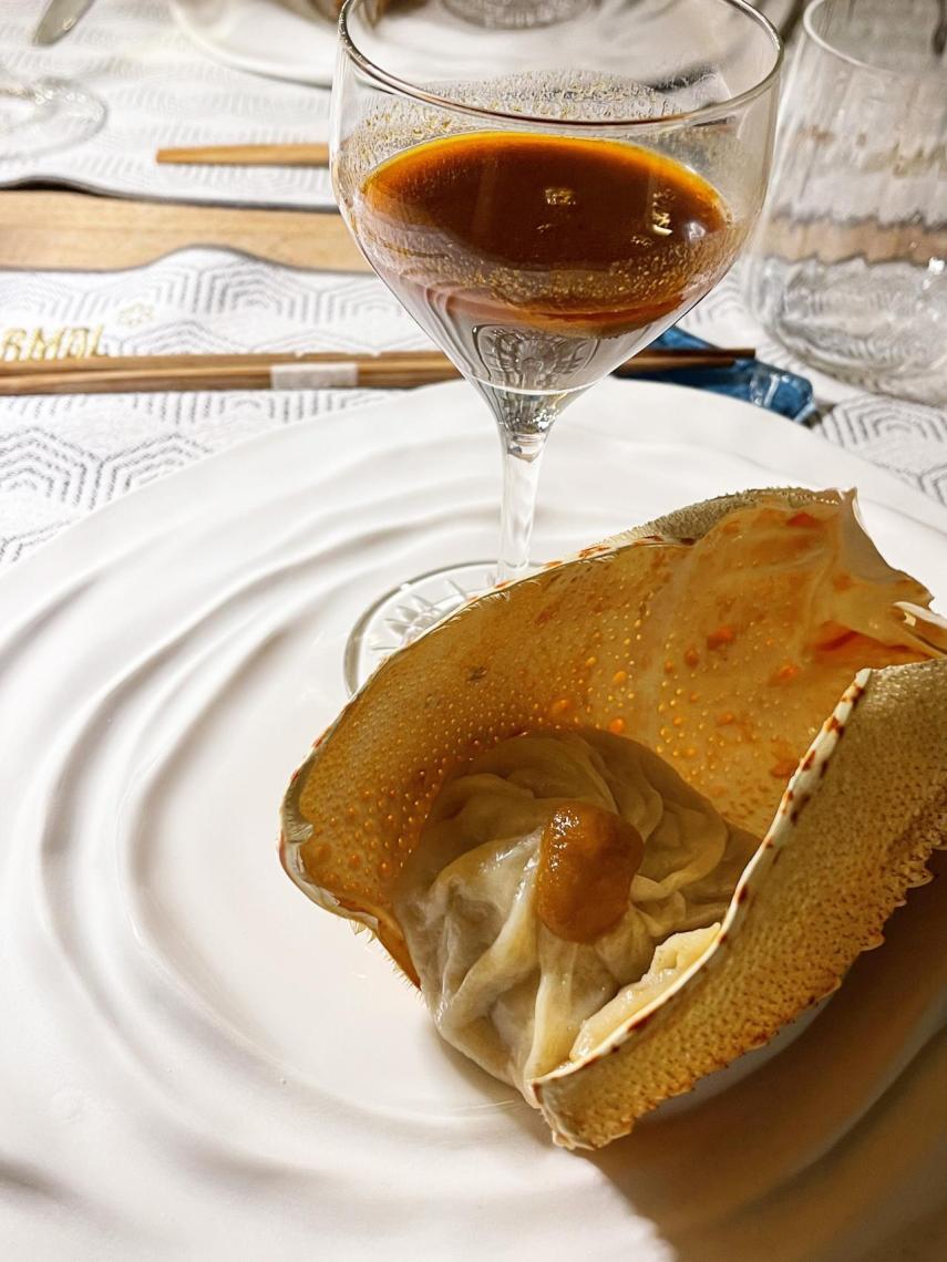 Continúa con otros platos para el recuerdo como la gyoza de sobrasada de lubina, un buñuelo de gamba roja de Menorca con salsa de su propio coral y ajillo o su homenaje a la caldereta de langosta, con un baozi relleno de la carne del crustáceo y un caldo concentrado.