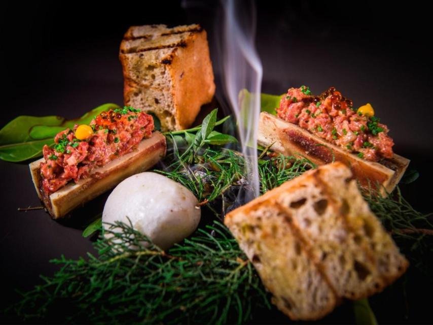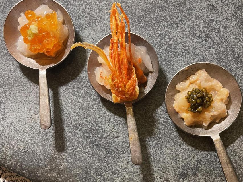 En él se puede probar fantásticos bocados como su trío de tartares del mar menorquín con gamba roja, gamba blanca y cigala, un fabuloso huevo poché de codorniz, con anguila ahumada y caviar Schrenkii y nigiris como el de salmón albino con xnipec o de carabinero con velo ibérico y su coral.