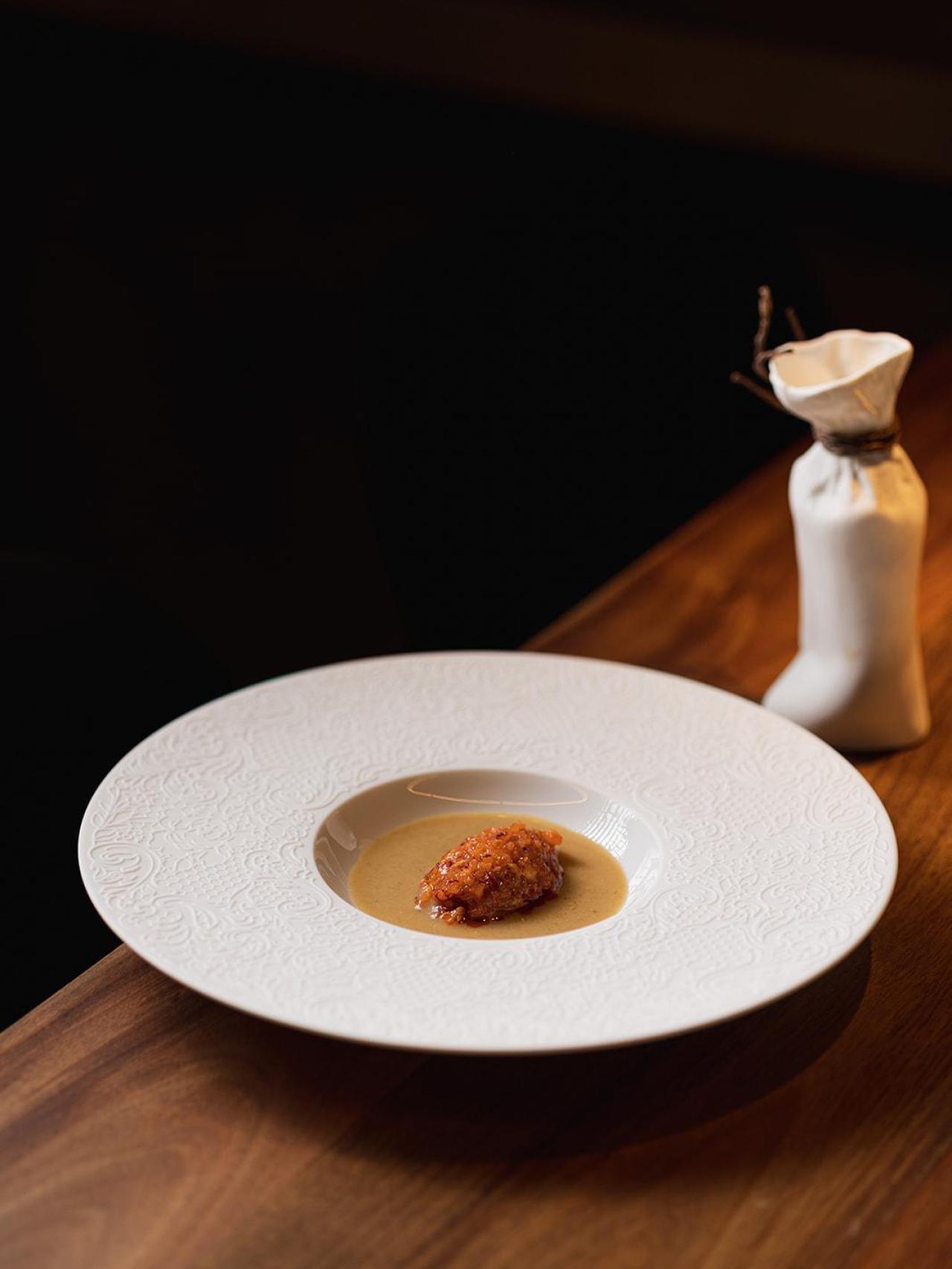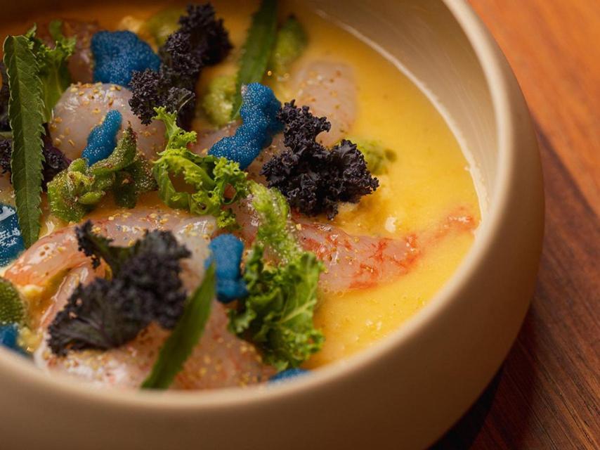 En su cocina, la reinterpretación de clásicos juega un papel esencial. Con su tierra por bandera, crean bocados como un buñuelo de boquerón en vinagre, que combina una masa frita con crema de berenjena, boquerón casero y un sorprendente aceite de boquerón texturizado. También destaca el tartar de camarón rojo y nueces de macadamia, con un gazpachuelo de garbanzo y comino que rinde homenaje a los guisos de las abuelas andaluzas, pero en versión fría.