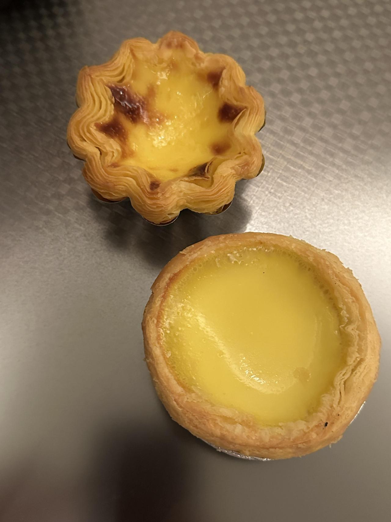 Solo egg tarts recién hechas, servidas en una bandeja metálica que se vacía en cuanto sale del horno. Su masa es clásica, su relleno también, y eso es precisamente lo que las hace especiales.