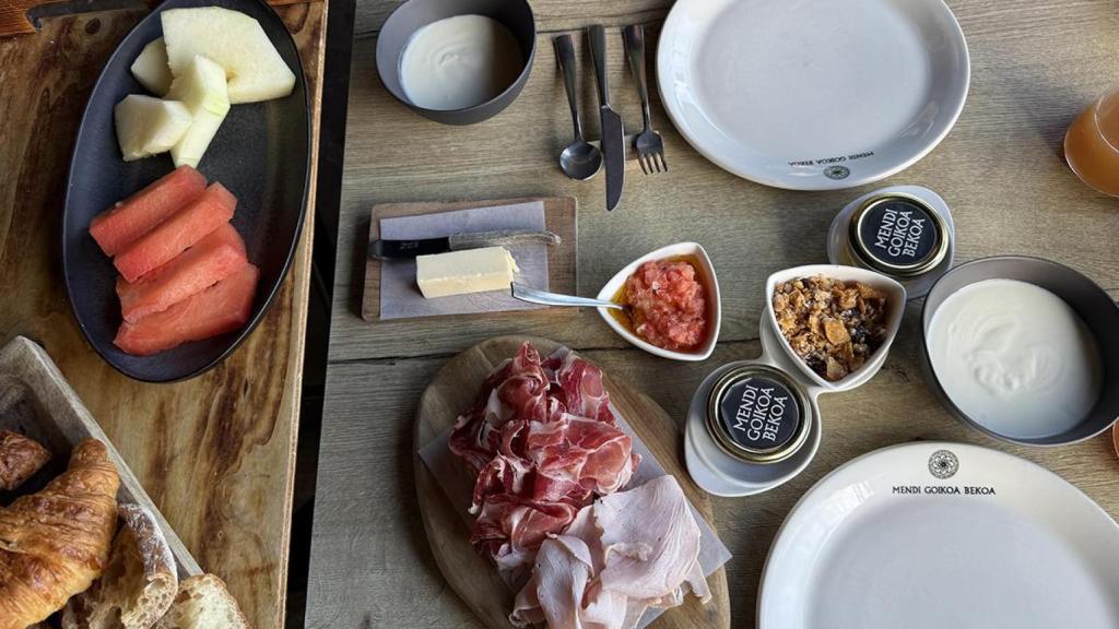 Arranca con pan de masa madre y dulces de Panarra, una panadería cercana, embutidos, mantequilla, yogur natural de Elorrio, granola casera y miel del valle. Y sigue con fruta y con un plato caliente hecho al momento. De unos benedictinos al brioche con aguacate y huevo a baja temperatura, pasando por propuestas más contundentes como unas migas de pastor.