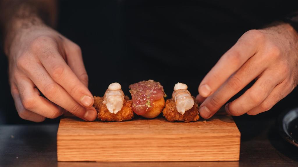 Entre los entrantes no conviene perderse sus croquetas de guiso de manitas, que se presentan coronadas con una cola de cigala, en un perfecto ensamblaje de un mar y montaña, su saam de atún picante, un magret de pato Pekín con salsa de cacahuete y platos como su brioche de sopa de cebolla y anguila.