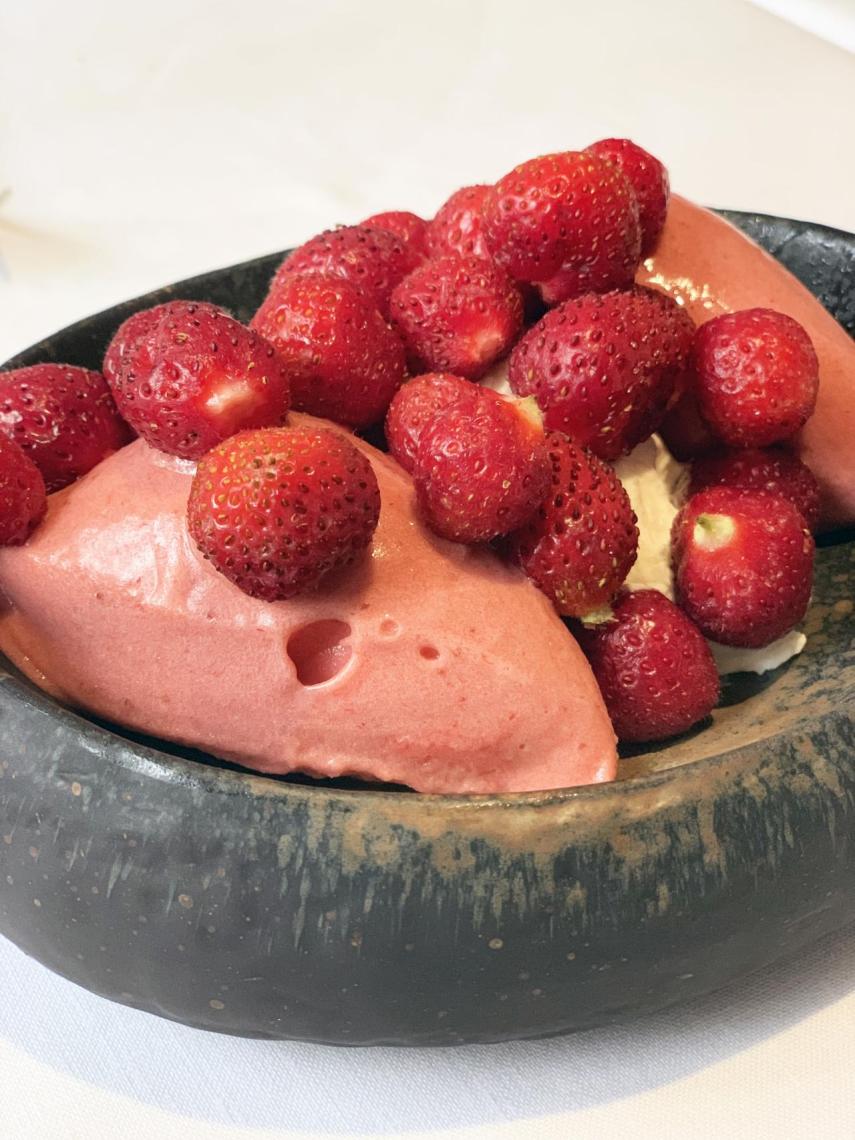 Esta vez sí, deja hueco para el postre, porque bordan el baba au rhum, que acompañan con helado de café y una delicadeza de temporada, las fresas de Hugo, que preparan con fresas de Monjarama -parecidas a las Mara des Bois francesas- con helado de nata y de las mismas fresitas. También puedes terminar a la francesa, con una selección de quesos del país.