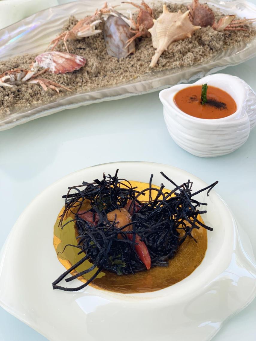 La experiencia en Quique Dacosta arranca en su terraza, donde tiene lugar el 1º Acto: "Preámbulo de tu retrato". En esta estancia, donde bien se puede disfrutar al aire libre o en un salón acristalado con aire acondicionado, tomamos los aperitivos. Una sopa fría de guindillas ahumadas, una refrescante ensaladilla de flores y una sorprendente puesta en escena con una fideuà rossejat de erizos, que acompañan con una especie de playa de arena comestible, con cangrejos de roca que se comen enteros y se untan en salmorreta.