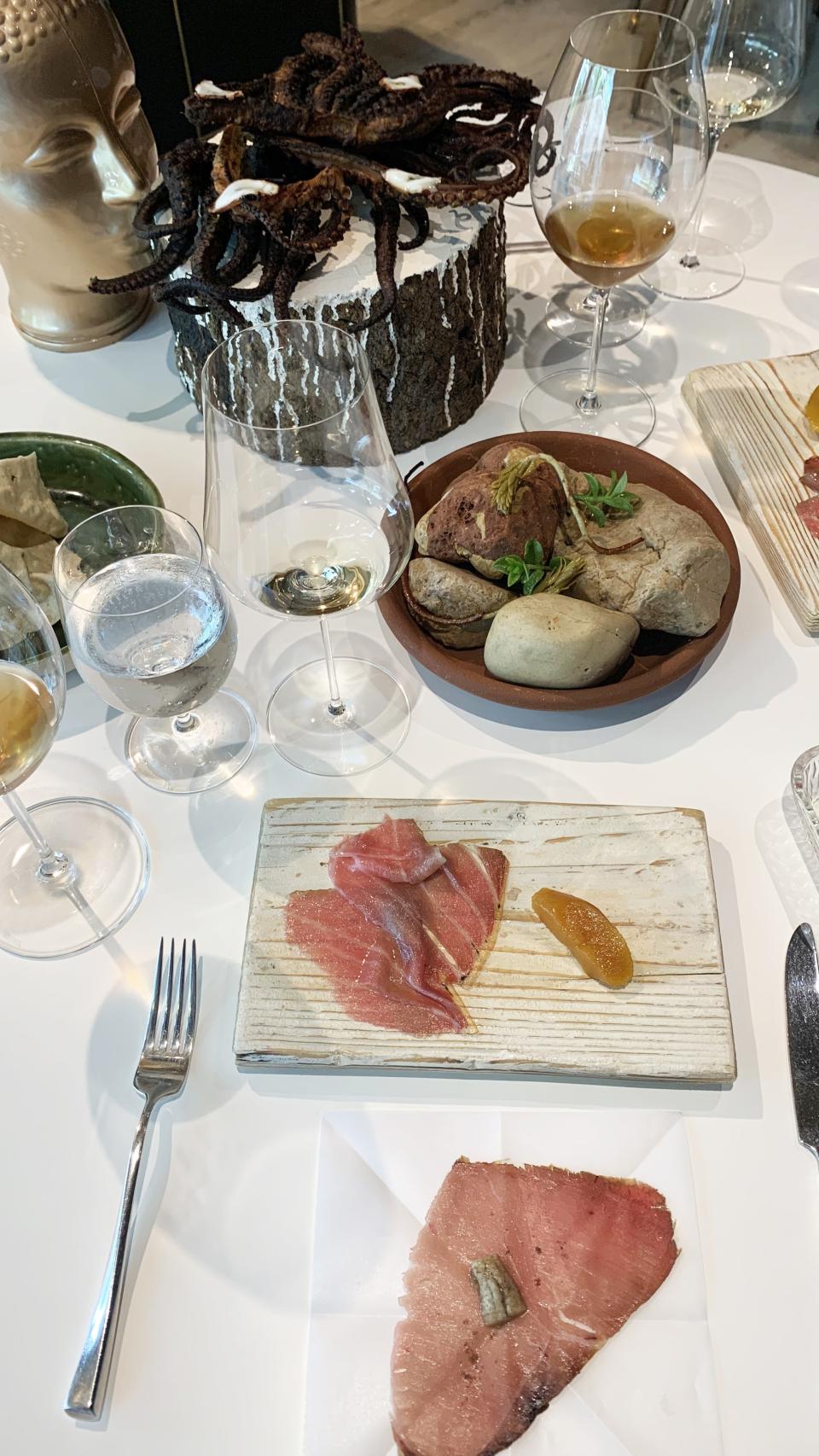En este momento pasamos a la sala. Las mesas se presentan desnudas, sin mantel, sin nada más que una de las icónicas cabezas que adornan cada una de ellas. Si tenéis ocasión, pedid que os atienda José Antonio Navarrete, el sumiller del restaurante, que hace que la experiencia sea en sí sobresaliente. Navarrete habla con el corazón en la mano, apuesta por vinos del territorio, conoce a la perfección cada cosa que acontece en la mesa y con ello el maridaje perfecto, que no hace sino acompaña y ensalzar cada paso en el camino.