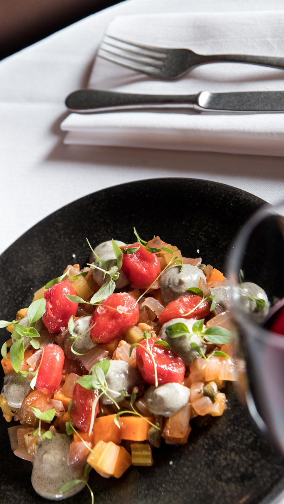 Entre los antipasti, conviene probar su caponata, en la que en vez de mezclar con berenjena, preparan con ésta una crema de berenjena a la llama que liga el plato. Las verduras están al dente y en cuadraditos y se completa con apio, zanahoria y tomate siciliano.