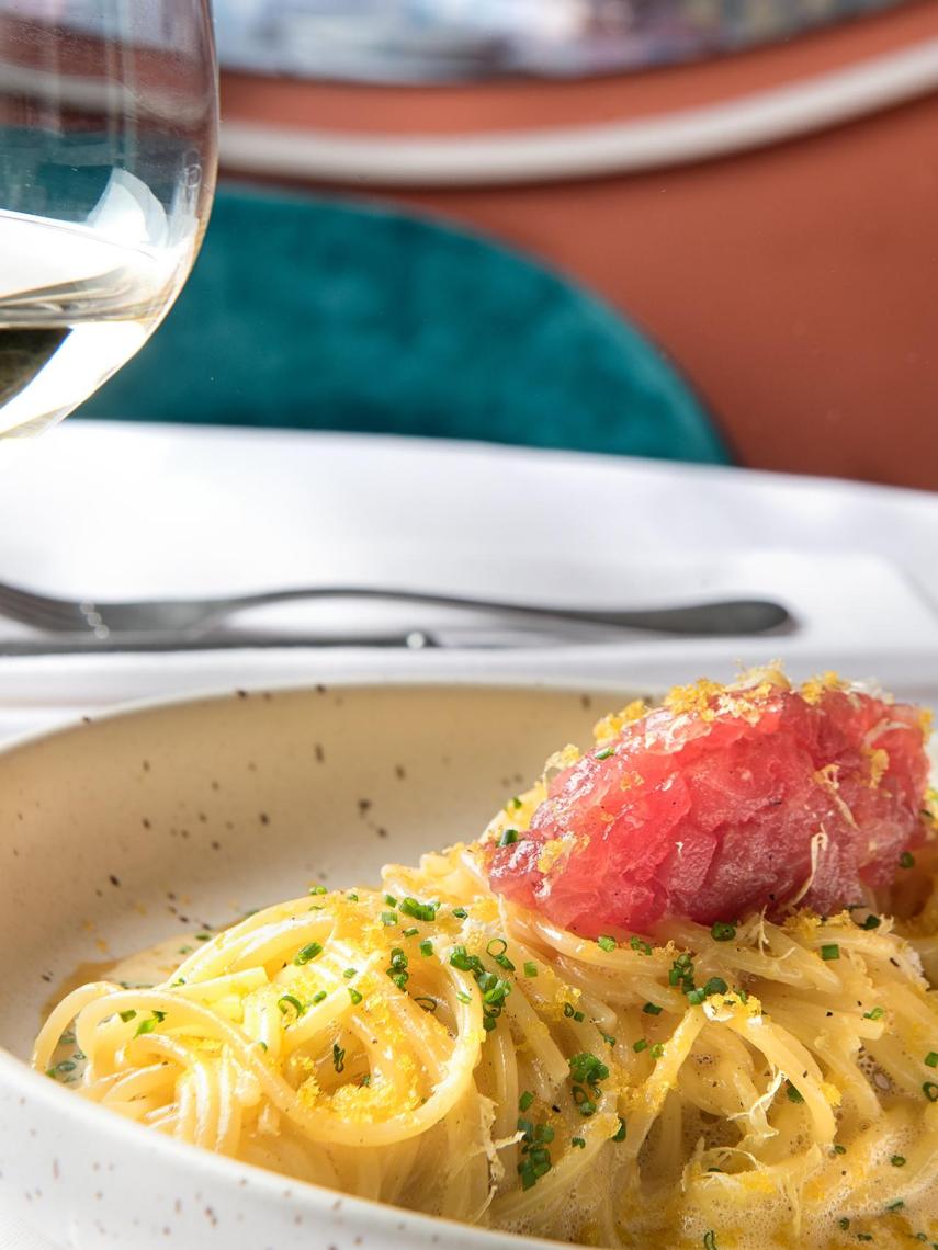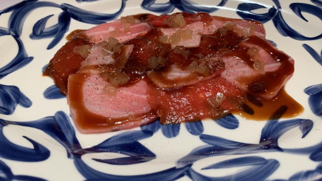 Otro de los platos que sorprende, es el carpaccio de atún rojo. Aquí una vez más, Gianni Pinto nos demuestra cómo, inspirándose en platos clásicos de la cocina italiana, logra darles un giro radical. En este caso, el carpaccio se presenta con sandía asada, una delicada ventresca de atún rojo y la salsa del tradicional vitelo tonnato.