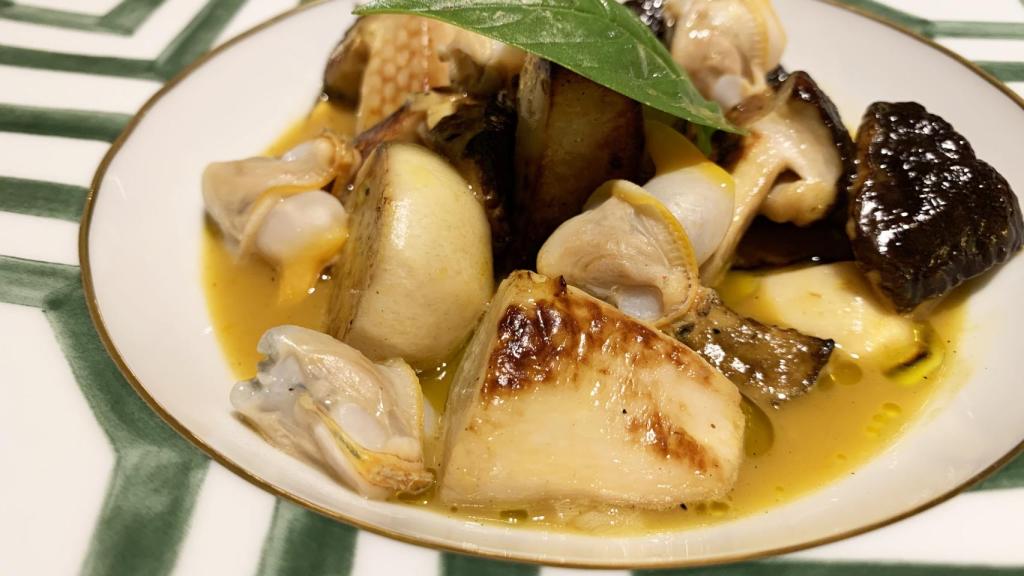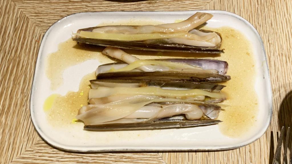 Los mariscos también son fijos en carta, como es el caso de las navajas con puerro a la brasa y escabeche de palo cortado (15 € media ración), el berberecho de Noia (precio según mercado) o la almeja gallega con jugo de códium (18 € media ración)