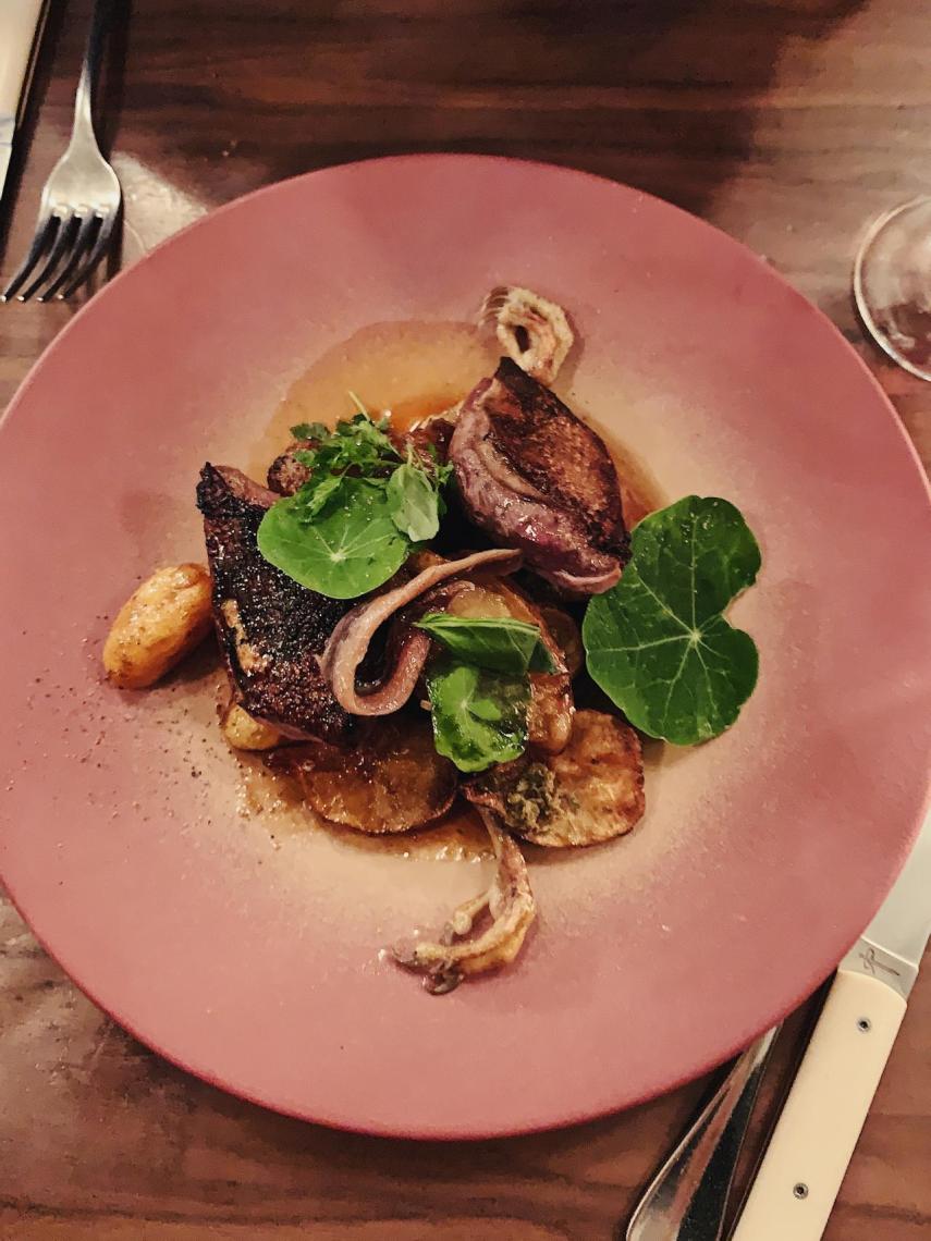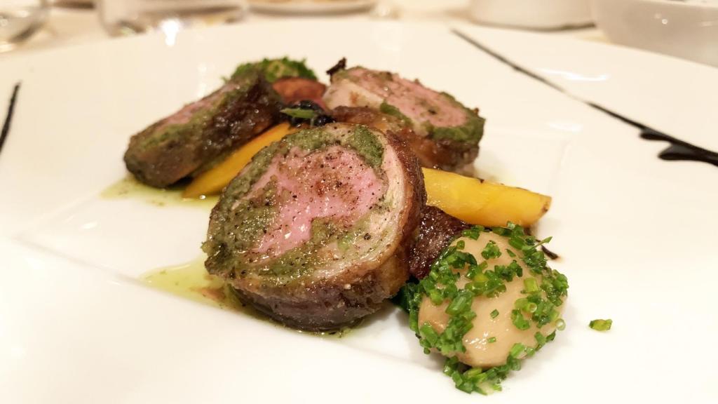 Continúa con un plato principal, en nuestro caso un cordero de Lozère, perfumado al orégano, que se deshacía en boca y acompañado de tubérculos y ajo confitado. Lo servían junto a coliflor con tinta de calamar y gnocchi de lentejas verdes de Le Puy.