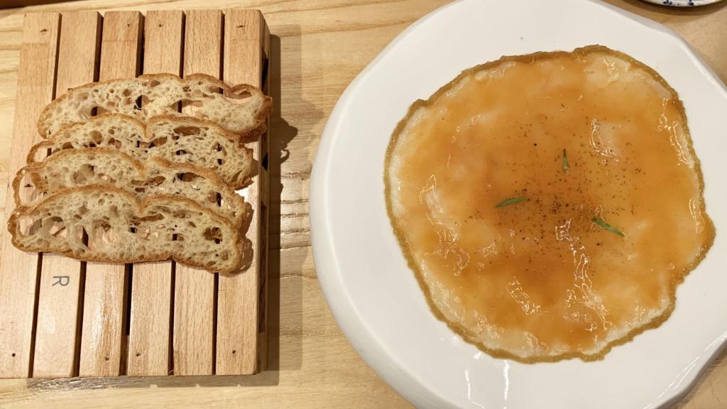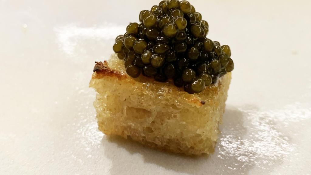 Nuestra experiencia arrancaba con un aperitivo de la casa, unas aceitunas sevillanas, bígaros y boquerón en vinagre, acompañados de su pan natural. ¿Otro de los hits para abrir boca? Un pan que tuestan con mantequilla y coronan con caviar, puro disfrute de un solo bocado.