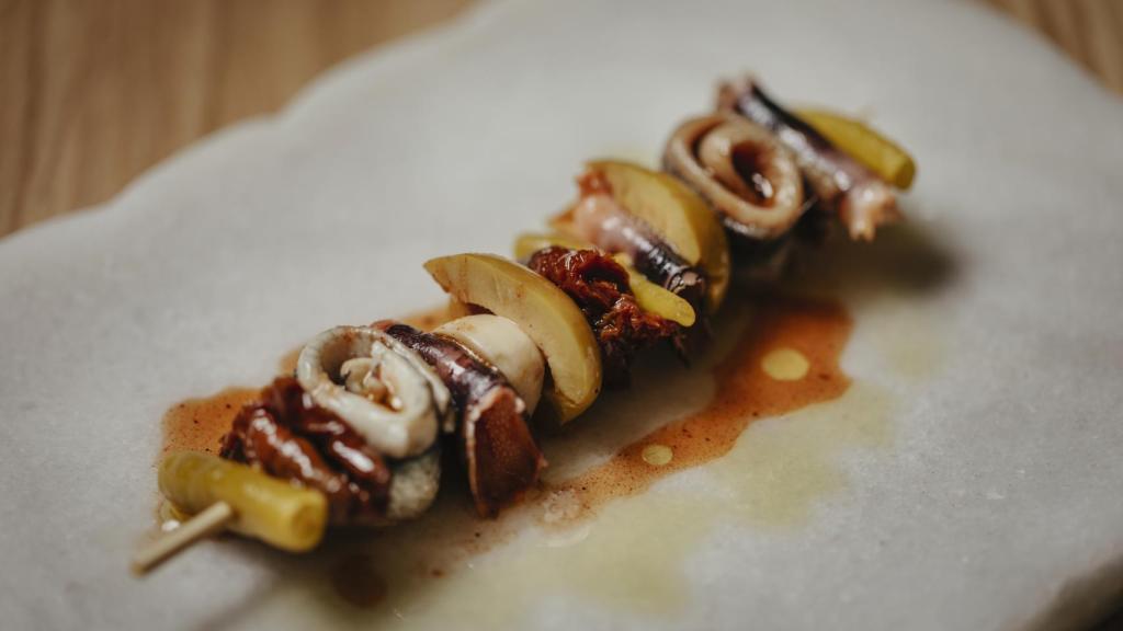 Llegaba a la mesa su ya aclamada gilda, un pincho para comer de dos bocados, en el que insertan guindilla, percebes, aceituna, tomate seco, boquerón o anchoa y aceituna. Una gilda de alto standing que ya nos hace presagiar que aquí el producto es de lo mejor. Siguiente bocado, las anchoas de primavera del Cantábrico (21 euros), ejemplares de un calibre envidiable, más saladas de lo normal, pero un sabor salino que acompaña por que son de cuando empiezan a criar, que sirven con pan de Cal Mossén con tomate por encima.