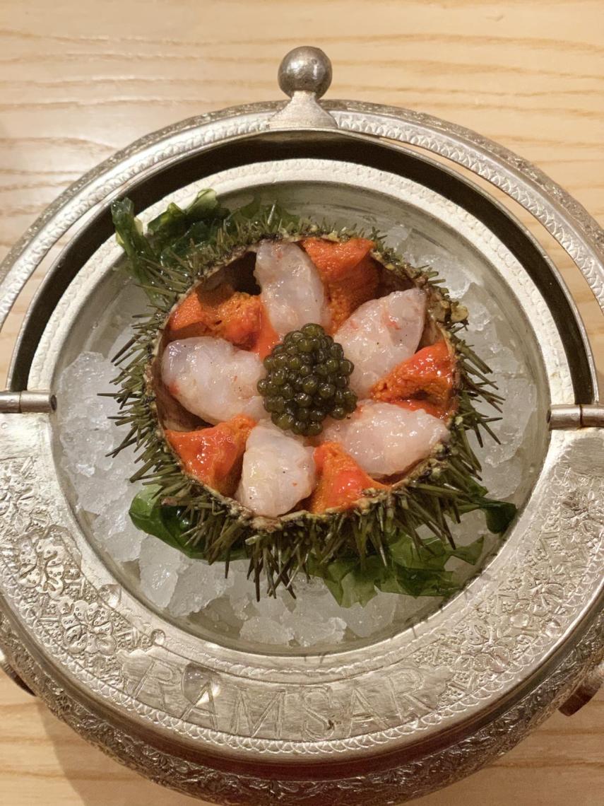 Cuando ya estás anonadado de tal despliegue, que encima no ha hecho más que empezar, llega un tesoro a la mesa, un estratosférico erizo de mar, con tartar de gamba y caviar. ¡Qué plato! Permanecerá en mi memoria por mucho tiempo.