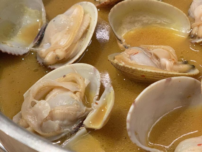 Seguimos con las conchas, que vienen en un apartado de la carta que se llama 'Al Fuego'. Probamos unas excepcionales almejas salteadas con fino Quinta (32 euros) y unas navajas a la sartén con un escabeche tibio y ligero (16 euros). Ambos platos para mojar pan.