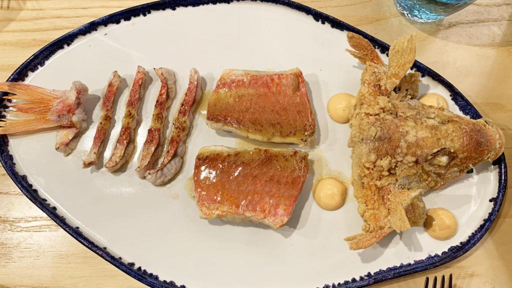 ¿Qué faltaba? La reina de Estimar, la gamba roja de Roses (29 euros / 100 gr.), que puede tomarse hervida o plancha y conviene tomar una de cada para poder comparar y el pescado, que aquí advierten que está sujeto a estacionalidad, a la destreza de los pescadores y al consentimiento de la Virgen del Carmen. En nuestra visita tomamos un salmonete (Precio según mercado). Pero claro, no era un salmonete cualquiera. Lo presentan en tres cocciones. La cabeza se fríe y se puede comer entera, los lomos se marcan en la brasa del Josper con una ajada y la cola se presenta soasada y aliñada con una vinagreta de Jerez. Las nuevas formas de comer pescado han llegado a la ciudad.
